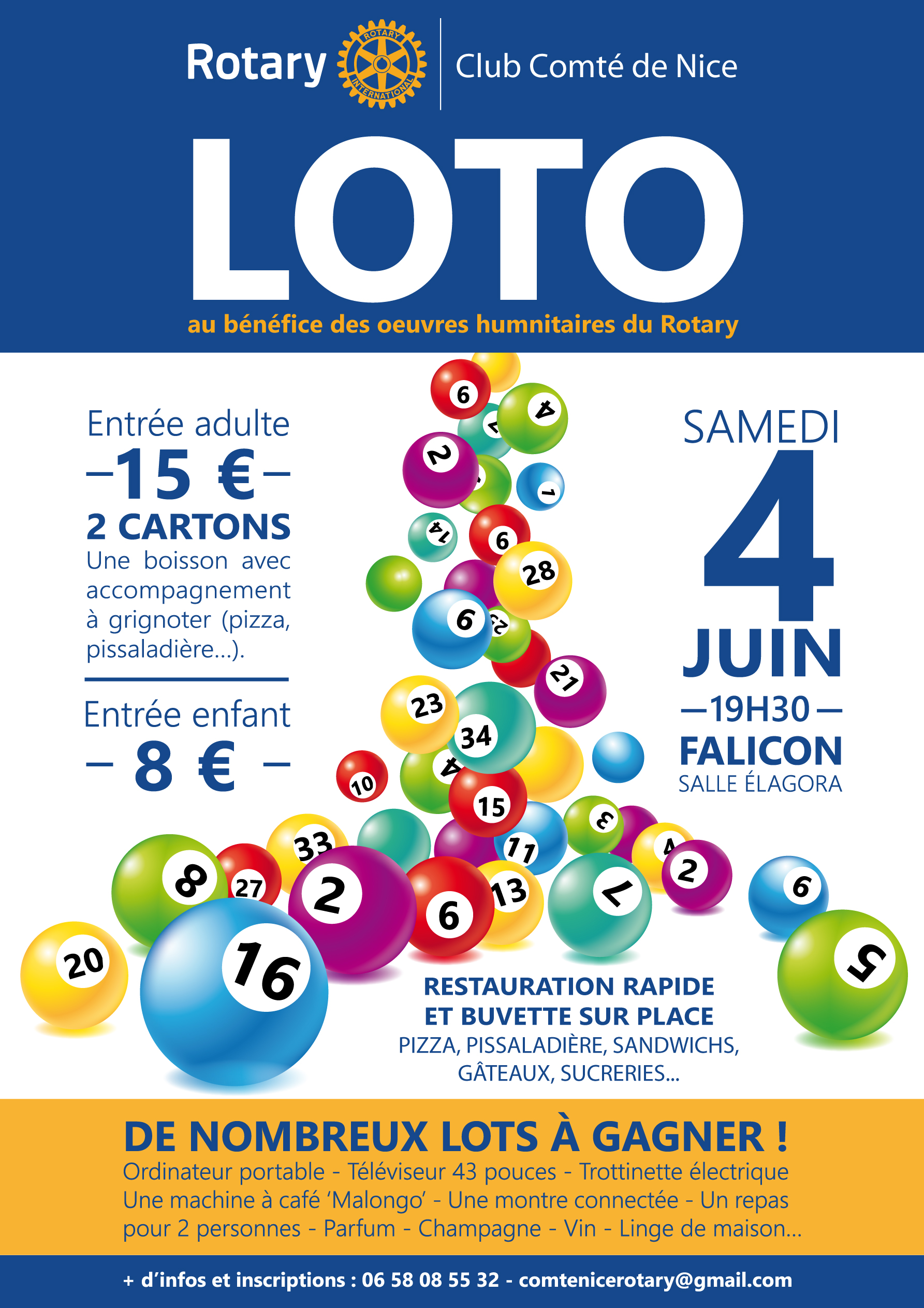 Le Rotary Club Comté de Nice, vous propose un loto au bénéfice des œuvres humanitaires du Rotary, samedi 4 juin 2022 à 19h30, salle Élagora à Falicon.