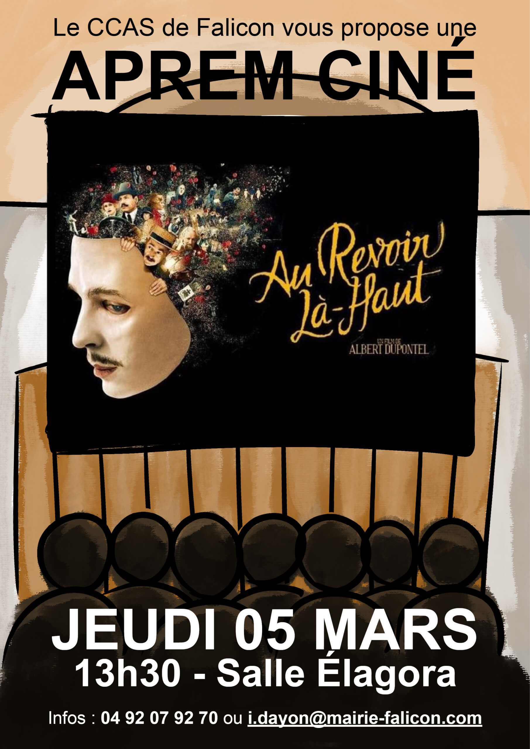Dans le cadre du CCAS de Falicon, la mairie propose à nos séniors (+ de 65 ans) de participer à une après-midi récréative avec la diffusion du film «Au revoir Là-haut» d’Albert Dupontel, suivi d’un goûter.