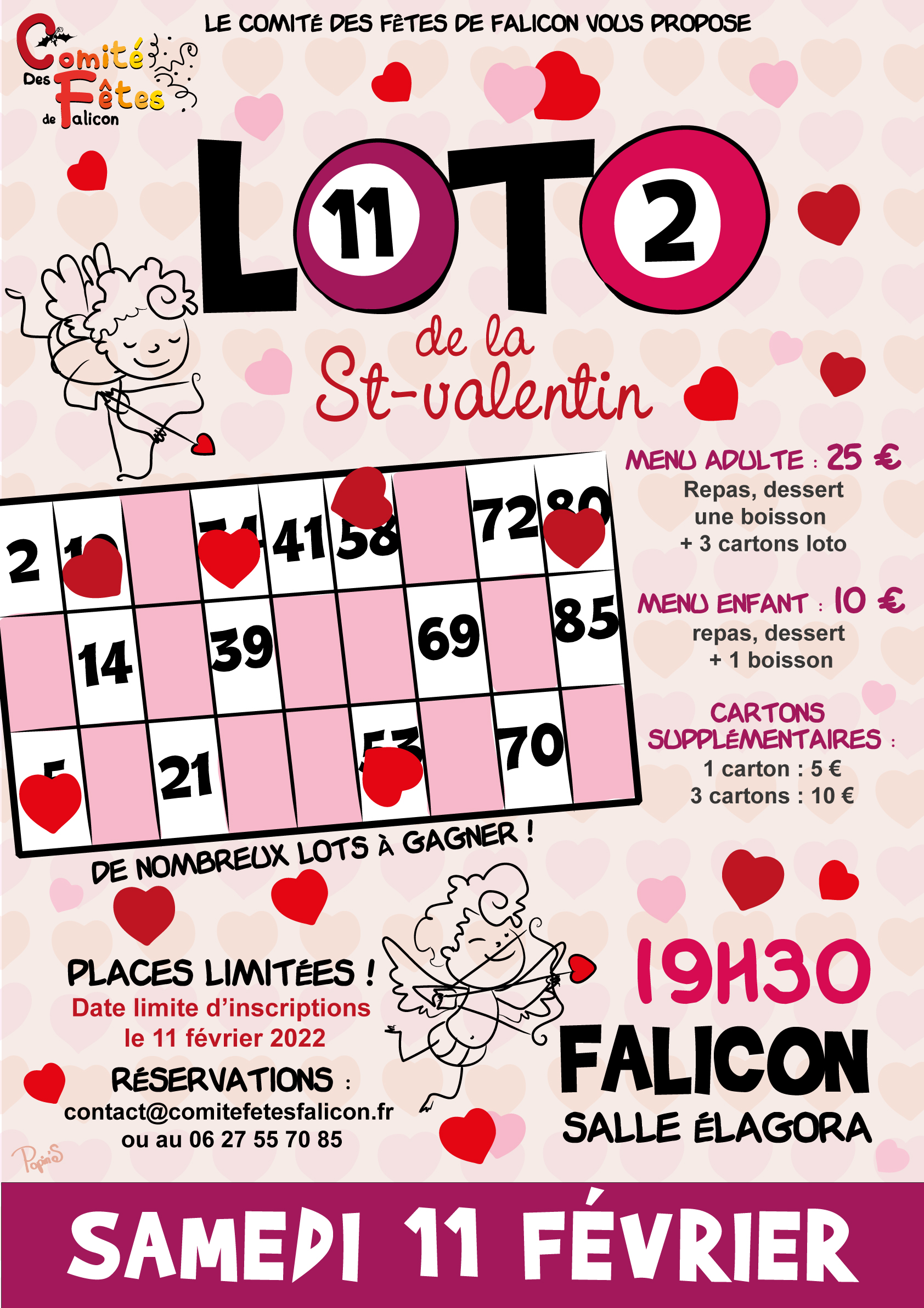 Le Comité des Fêtes de Falicon organise pour sa première manifestation de l’année avec la soirée « Loto de la St-Valentin », samedi 11 février 2023 à 19h30, salle Élagora.