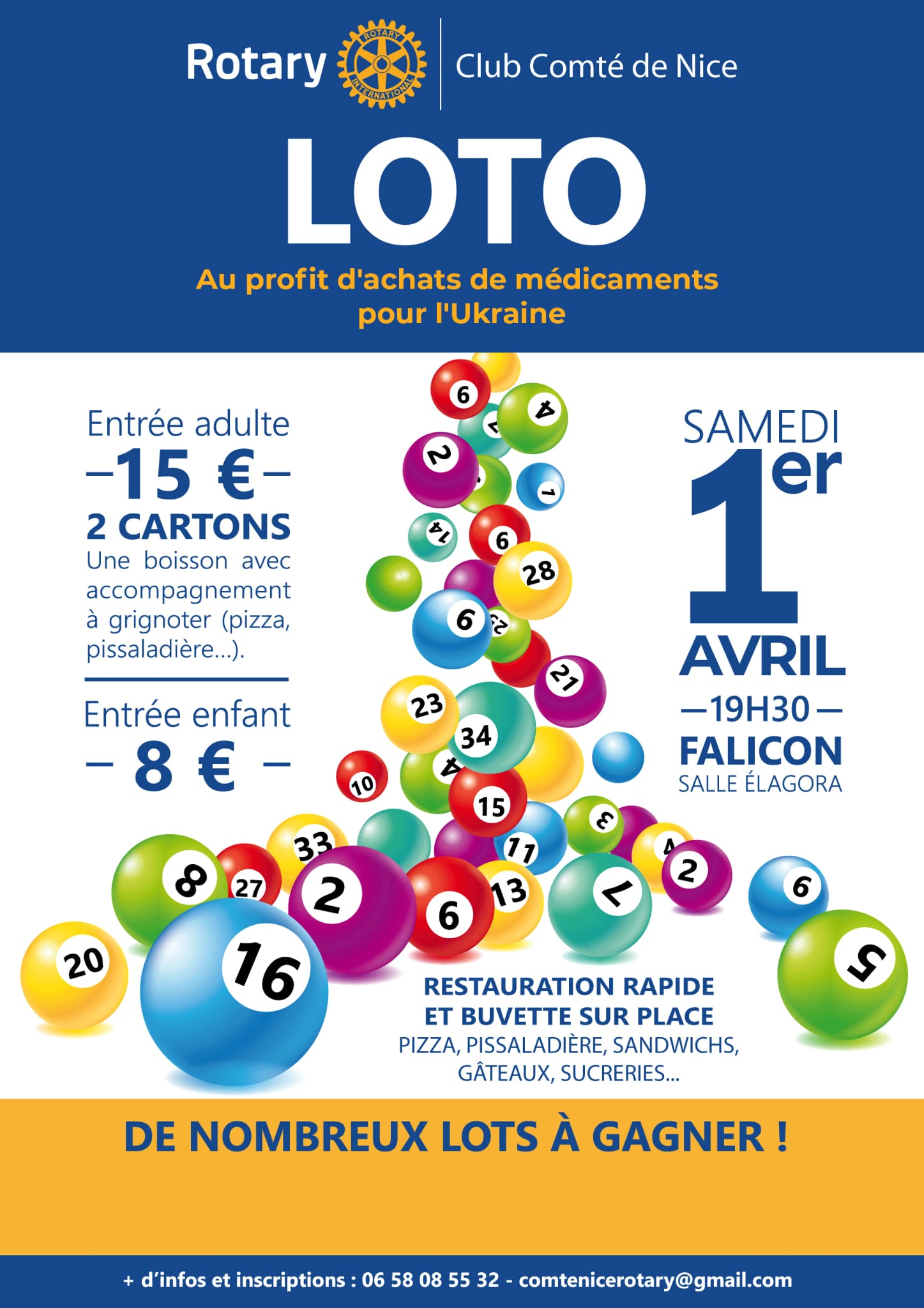 Samedi 1er avril, le Rotary Club du comté de Nice organise un loto au profit d’achats de médicaments pour l’Ukraine, à Falicon, dans la salle Élagora.