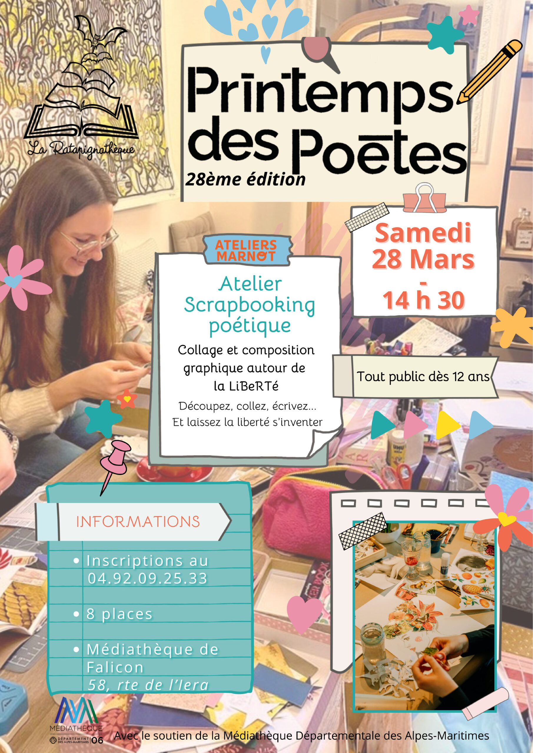 Dans le cadre du Printemps des Poètes 2026 (28ᵉ édition), la Médiathèque de Falicon et Les Ateliers Marnot, avec le soutien de la Médiathèque Départementale des Alpes-Maritimes, proposent un atelier de scrapbooking poétique autour […]