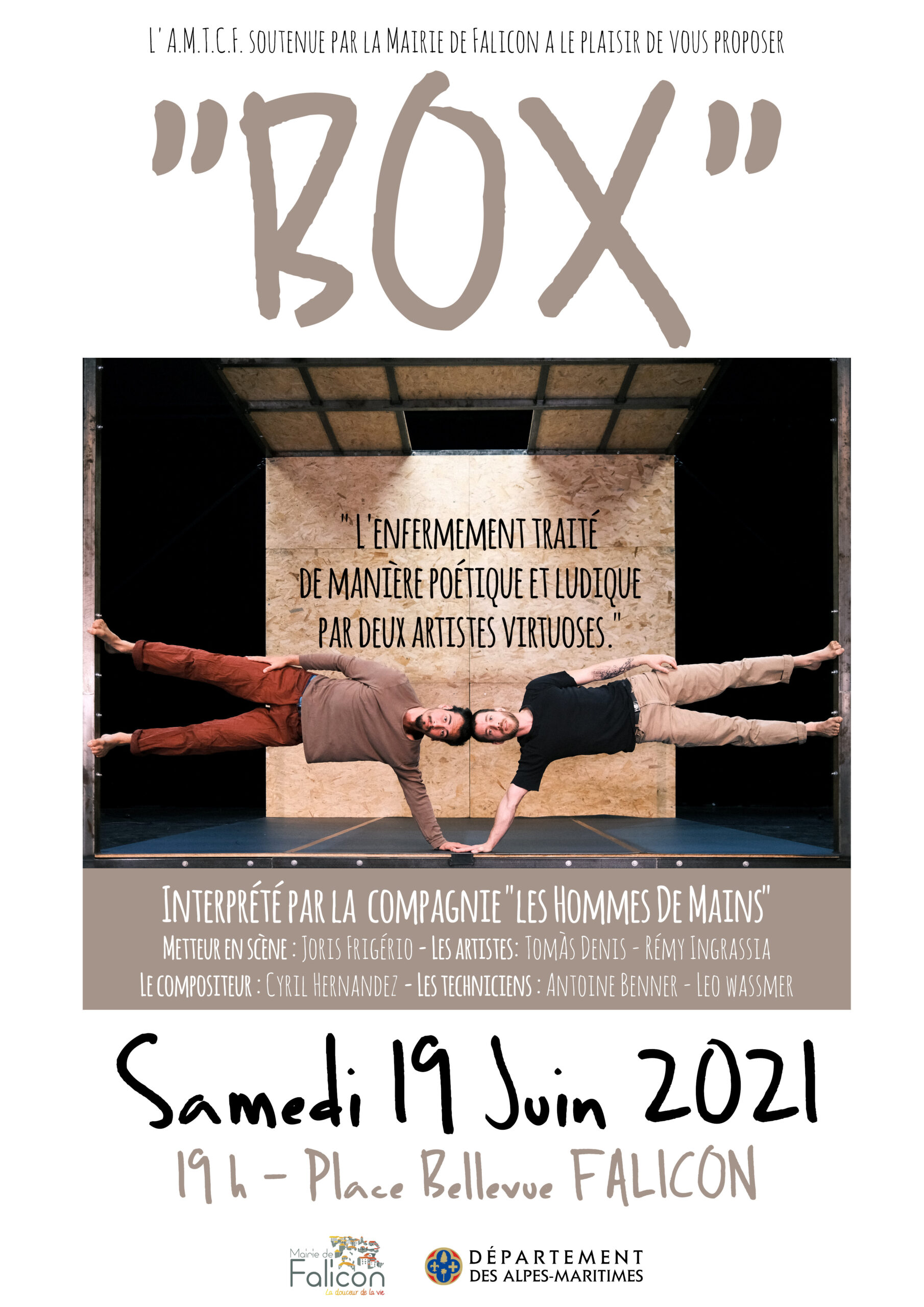 L'A.M.T.C.F. soutenue par la Mairie de Falicon a le plaisir de vous proposer "BOX", un spectacle interprété par la compagnie "les hommes de mains". Dans un cube de 3mx3m, deux circassiens répondent à la question de vivre avec l’enfermement ? Ce thème est ainsi traité de manière poétique et ludique par deux artistes virtuoses qui […]