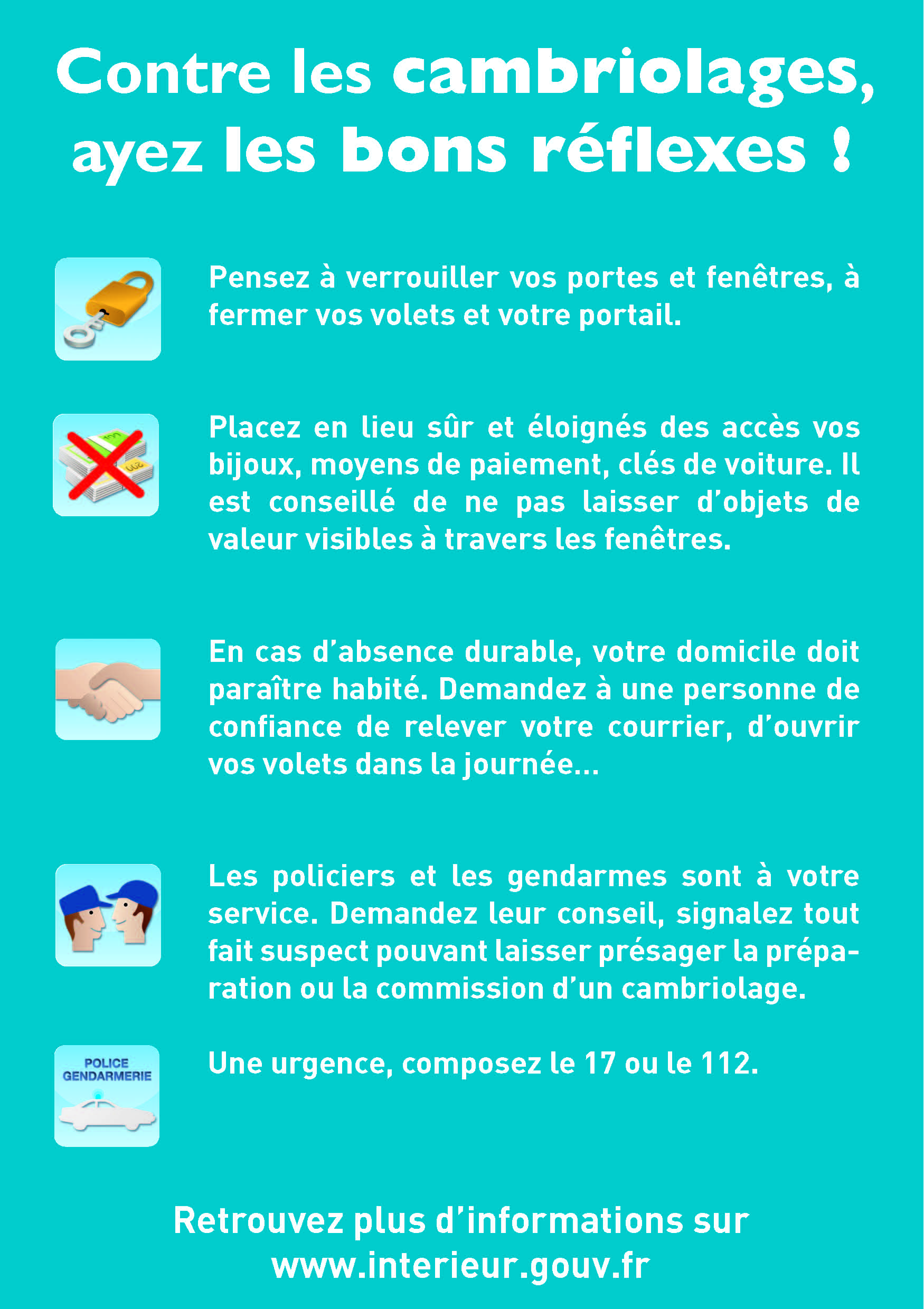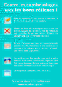 Signalez au commissariat ou à la gendarmerie tout ce qui peut laisser présager la préparation ou la commission d’un cambriolage.
