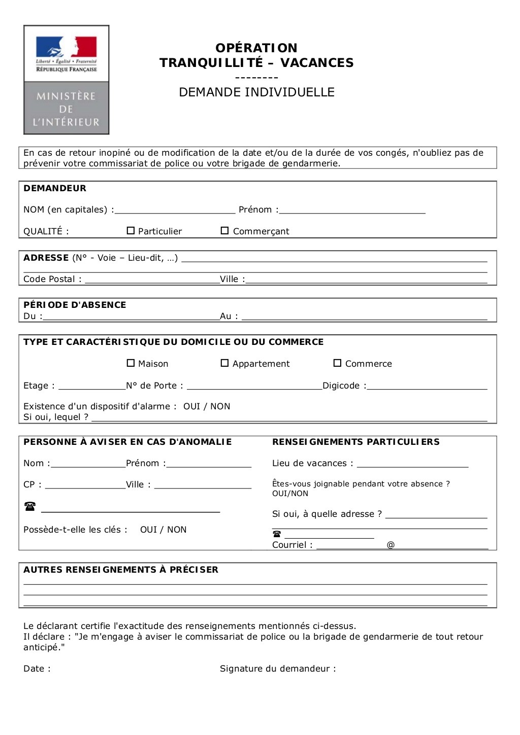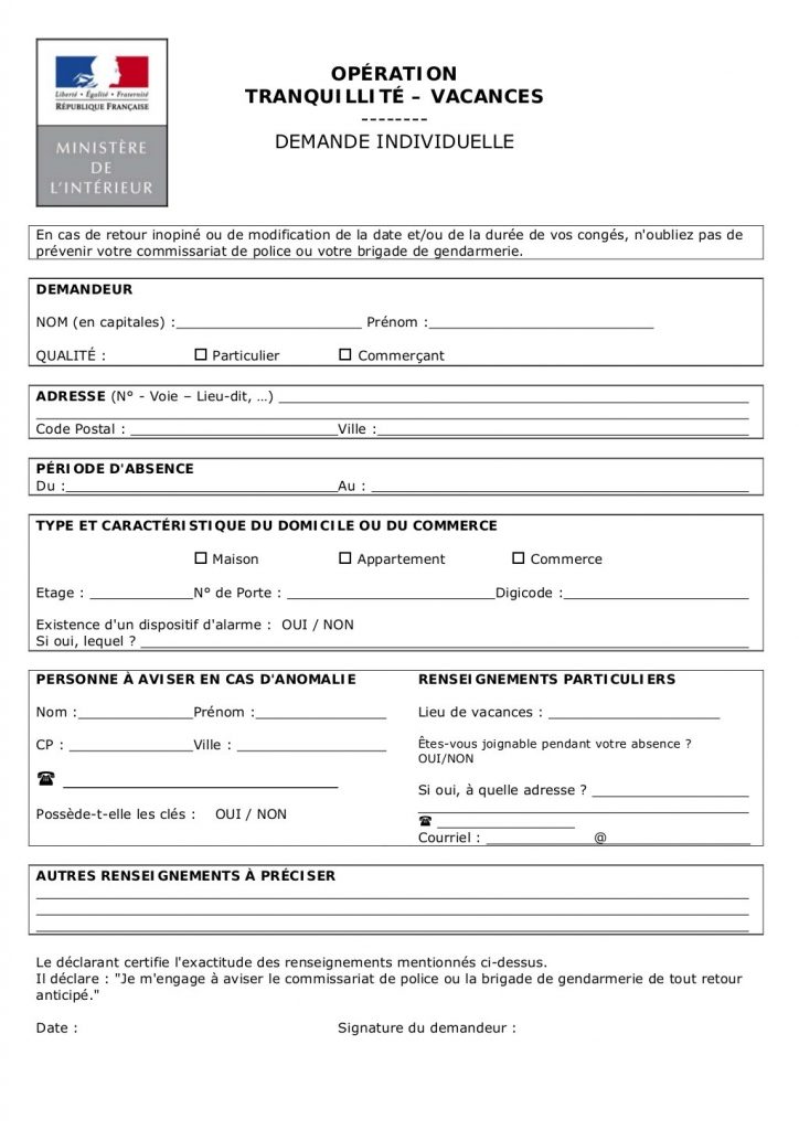 La police municipale et la gendarmerie veillent sur les logements laissés vides pour les vacances, vous pouvez dès à présent, télécharger le Formulaire à remplir et à déposer ou renvoyer à la police municipale si vous devez vous absenter quelques jours de votre domicile.